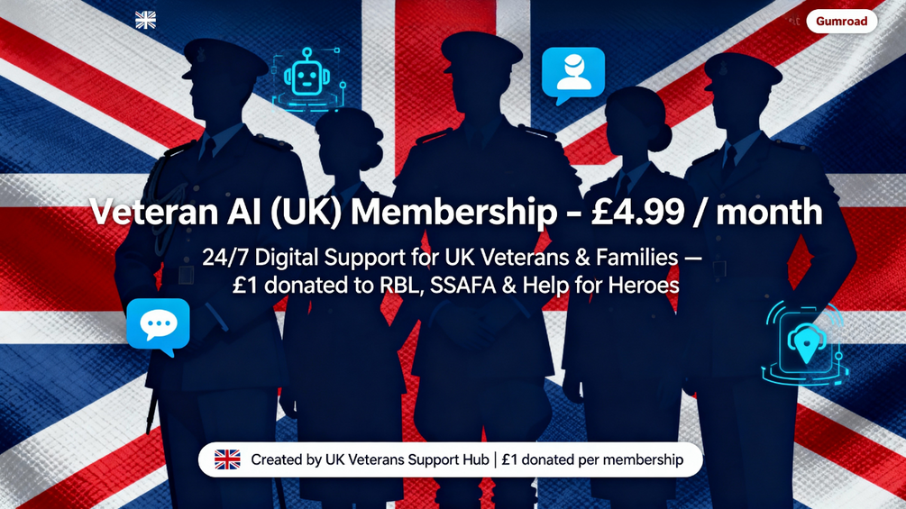 Veteran AI (UK) is the first 24/7 digital support assistant built for UK veterans and their families. Get instant, verified help with benefits, housing, mental health, funding, and family resources — all in one trusted place. Powered by the UK Veterans Support Hub and backed by real data from GOV.UK, NHS, and leading charities. 💷 Only £4.99/month — and £1 from every membership goes directly to The Royal British Legion, SSAFA, and Help for Heroes to support veterans across the UK. 🎖️ Fast answers. Real support. Giving back to those who served.